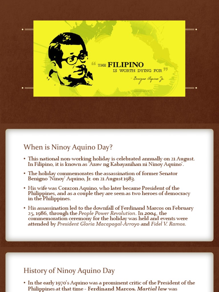Ninoy aquino was one of the more prominent members of the opposition against the. You may contact kwd customer service at tel. There are 132 days left in the year. The filipino is worth dying for. This day is celebrated on august 21st each year and commemorates the life of senator ninoy aquino jr and his wife corazon.